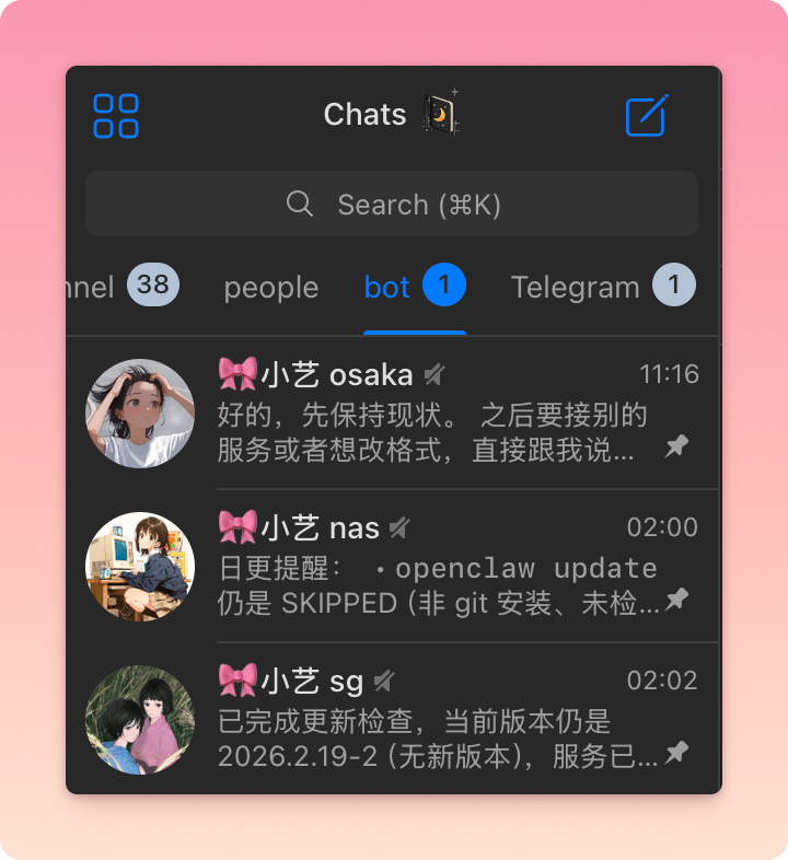Openclaw 像是个小助手,如果一个助手坏了,你可以用另一个助手去修它。从下图你可以看到,我有三个安装在不同服务器上的 Openclaw ai bot,过去一周,我常常干的事情就是,如果其中一个坏了,就让另一个登陆到机器,然后修好坏掉的那个。