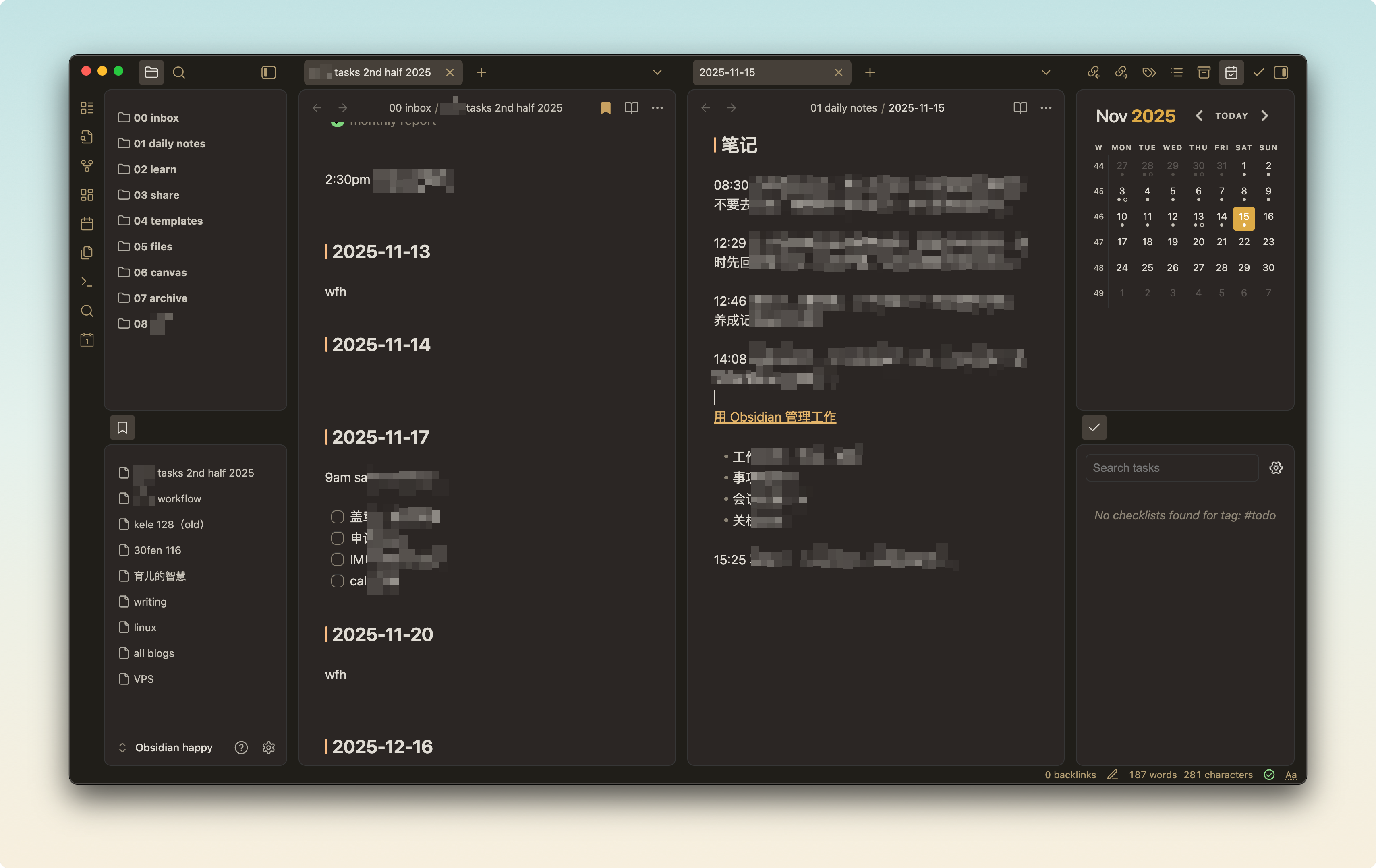 每一天到公司之后,我会打开电脑,连上显示器。我的主屏是一个24寸显示器,副屏就是笔记本的屏幕,副屏上,是全屏打开的 Obsidian,布局分为四栏,从左往右,第一栏是文件夹和收藏页面,第二栏就是工作日历,第三栏,是 daily note,也是我的间隙日历,记录想法和乱七八糟的事情,第四栏,是真正意义上的日历,以及“checklist”插件显示的待办事项。